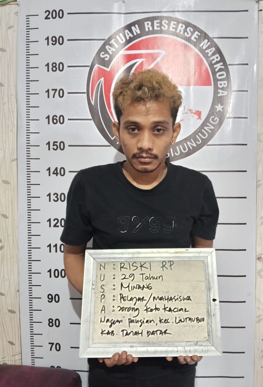Pelaku yang diamankan diketahui berinisial RISKI RP, berusia 29 tahun, berdomisili di Jorong Koto Kaciek, Kenagarian Pangian, Kecamatan Lintau Duo, Kabupaten Tanah Datar. Meski berstatus pelajar atau mahasiswa, ia diduga turut serta dalam penyalahgunaan narkotika golongan I jenis shabu.