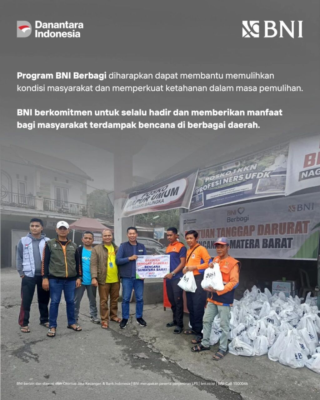 Melalui program Tanggung Jawab Sosial dan Lingkungan (TJSL) bertajuk “BNI Berbagi”, bantuan tanggap darurat disalurkan langsung ke wilayah-wilayah yang mengalami dampak paling parah terutama di Kabupaten Agam, Tanah Datar serta wilayah lain yang membutuhkan penanganan cepat.