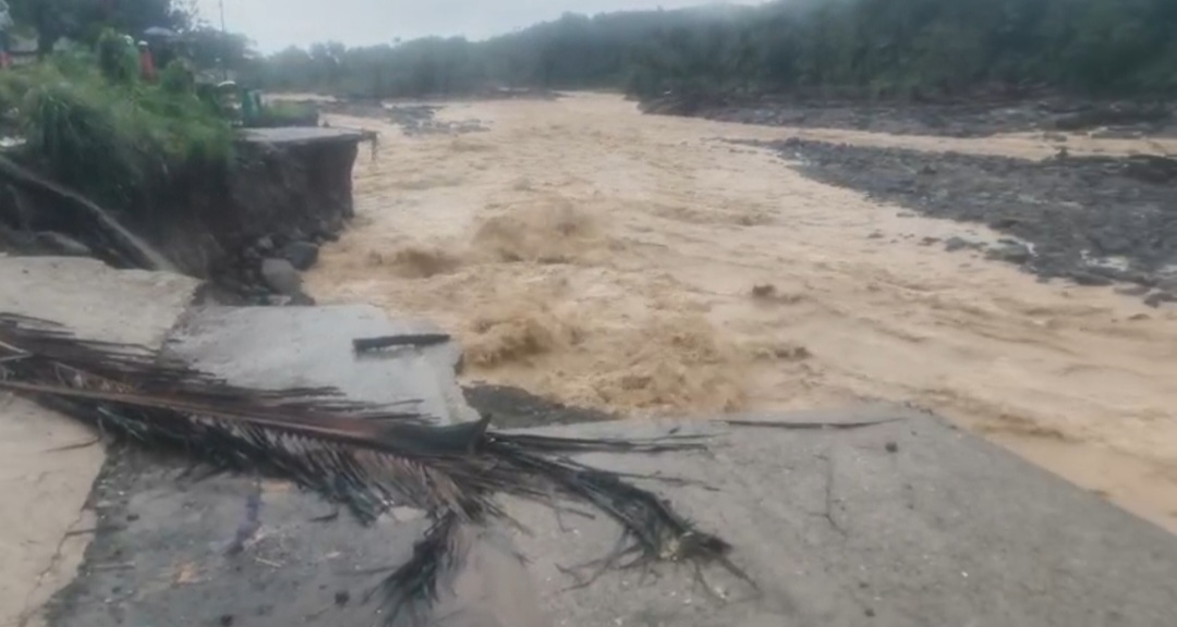 Luapan air sungai menggerus badan jalan hingga amblas dan tidak bisa lagi dilalui oleh kendaraan maupun pejalan kaki.