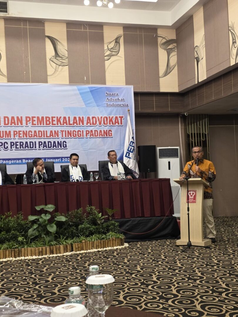 Rangkiangsumbar – Kegiatan pengangkatan dan pembekalan advokat Perhimpunan Advokat Indonesia Suara Advokat Indonesia (PERADI SAI) digelar di wilayah hukum Pengadilan Negeri Padang, Selasa malam (6/1), bertempat di Hotel Pangeran Beach, Kota Padang, Sumatera Barat.