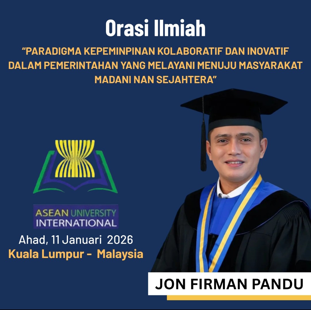 Dalam penganugerahan tersebut, Jon Firman Pandu menyampaikan orasi ilmiah berjudul “Paradigma Kepemimpinan Kolaboratif dan Inovatif dalam Pemerintahan yang Melayani Menuju Masyarakat Madani dan Sejahtera.”